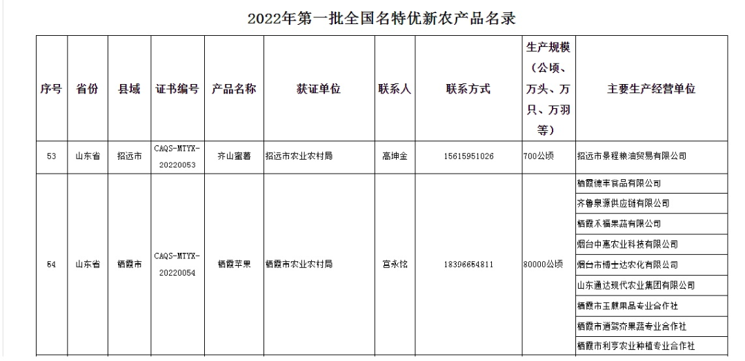 近日,農(nóng)業(yè)農(nóng)村部農(nóng)產(chǎn)品質(zhì)量安全中心發(fā)布了《農(nóng)業(yè)農(nóng)村部農(nóng)產(chǎn)品質(zhì)量安全中心公告》(第14號(hào)),公布了2022年第一批全國(guó)名特優(yōu)新農(nóng)產(chǎn)品。“棲霞蘋果”通過審核,被納入全國(guó)名特優(yōu)新農(nóng)產(chǎn)品名錄,本次上榜的棲霞蘋果產(chǎn)品主要由棲霞德豐食品有限公司、齊魯泉源供應(yīng)鏈有限公司、棲霞禾福果蔬有限公司、煙臺(tái)中惠農(nóng)業(yè)科技有限公司、煙臺(tái)市博士達(dá)農(nóng)化有限公司、山東通達(dá)現(xiàn)代農(nóng)業(yè)集團(tuán)有限公司、棲霞市玉麒果品專業(yè)合作社、棲霞市逍駕夼果蔬專業(yè)合作社、棲霞市利亨農(nóng)業(yè)種植專業(yè)合作社生產(chǎn)經(jīng)營(yíng)。此次上榜,意味著棲霞蘋果穩(wěn)定的品質(zhì)通過了國(guó)家嚴(yán)苛的農(nóng)產(chǎn)品質(zhì)量安全審核,棲霞蘋果再次以優(yōu)異的產(chǎn)品實(shí)力獲得國(guó)家和行業(yè)的權(quán)威認(rèn)證;意味著棲霞蘋果始終努力追求以產(chǎn)品質(zhì)量品質(zhì)為核心的產(chǎn)業(yè)行業(yè)標(biāo)桿品牌,始終堅(jiān)持以人民健康為中心的蘋果生產(chǎn)理念。